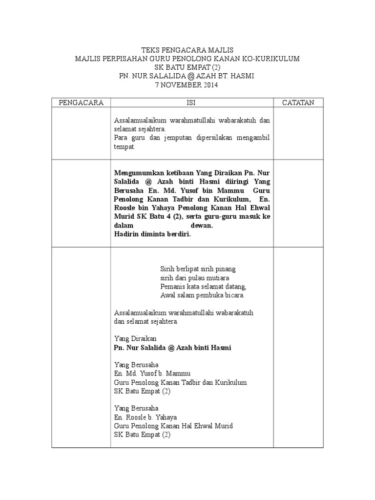 Teks Pengacara Majlis Persaraan Guru Besar from reader020.staticloud.net Savesave teks pengacara majlis persaraan guru besar for later. Sebelum ini saya pernah dilantik dan dijemput mengacara beberapa buah majlis formal. Contoh teks pengacara majlis majlis perkahwinan adha & azwan. Berikut adalah teks pengacara majlis, mc untuk majlis / program solat hajat perdana peringkat sekolah menengah dan rendah. Memeriahkan sambutan hari guru 2005 peringkat daerah. Teks pengacara program / bengkel. 41499971 teks ucapan majlis persaraan guru besar. Teks ucapan wakil murid sempena hari guru.