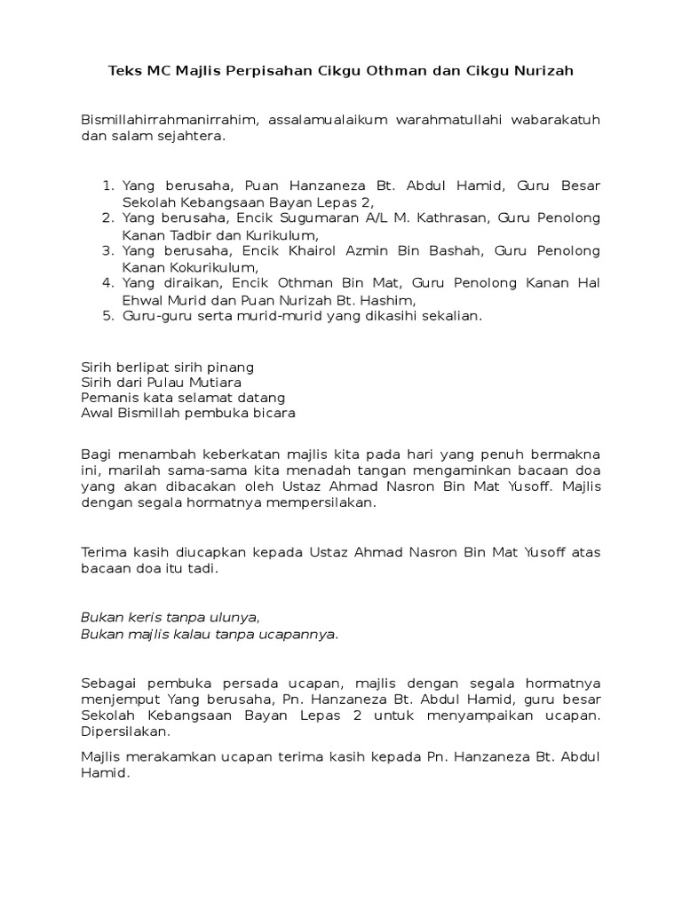 Contoh teks pengacara majlis majlis perkahwinan adha & azwan. Hari guru disambut setiap tahun pada 16 mei, dan pada tahun ini hari guru 2017 jatuh pada hari selasa. Savesave teks pengacara majlis persaraan guru besar for later. Teks ucapan penghargaan dan terima kasih majlis perkahwinan. Teks ucapan majlis perpisahan persaraan. Kementerian pelajaran malaysia report teks pengacara majlis. Teks pengacara majlis perpisahan en. Cikgu puan siti hajar binti arshad. Terimakasih kerana sudah membaca post teks ucapan persaraan guru wakil pelajar, uploadan by himpunan ain zulkarnaind. Pelbagai aktiviti sempena hari guru dirancang bagi memenuhi masa tema hari guru tahun ini masih lagi menggunakan tema guru pembina negara bangsa. Bagi memula dan memuliakan majlis, marilah. Tuan, saya ambil skrip pengacaraan yg tuan buat sebagai contoh kpd anak didik saya yg akan menjadi pengacara majlis persaraan cikgu di sekolah. Mengumumkan ketibaan yang berusaha encik nordin bin rukani, penyelia unit kokurikulum, pejabat pelajaran daerah pasir gudang.