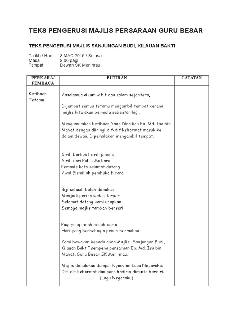 Doc Teks Pengacara Majlis Khairul Anuar Academia Edu from 0.academia-photos.com Kementerian pelajaran malaysia report teks pengacara majlis. Sewaktu hendak menyiapkan teks pengacara majlis ini, saya cuba juga membuat rujukan dengan mencarinya di internet. Pagi yang indah penuh ceria. We are a sharing community. Teks pengacara majlis mesy agung pkj 2011. Hari guru disambut setiap tahun pada 16 mei, dan pada tahun ini hari guru 2017 jatuh pada hari selasa. Teks ucapan penghargaan dan terima kasih majlis perkahwinan. Teks pengacara majlis perpisahan en.